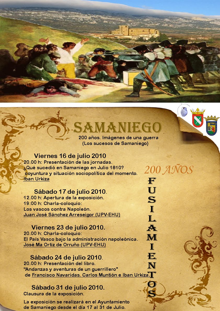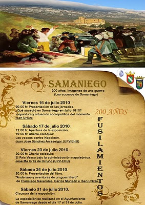 Durante la segunda quincena de Julio se llevarán a cabo distintos actos en la localidad de Samaniego, en La Rioja Alavesa, que servirán de recuerdo a los 6 jóvenes fusilados por el ejército napoleónico en 1810, y que podeís ver en la imagen del cartel que reproducimos aquí: