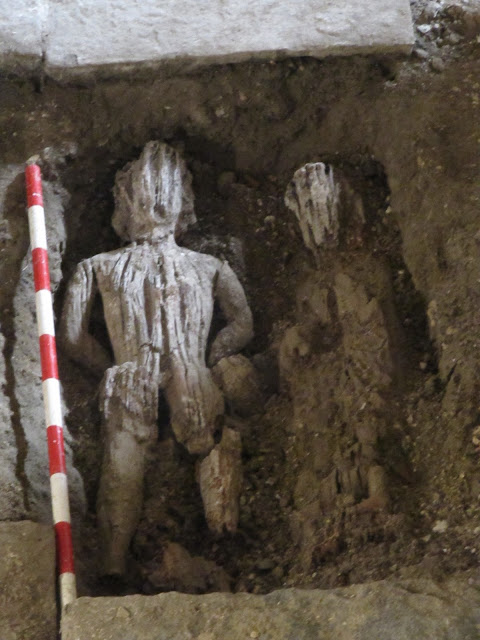 sendas tallas de madera enterradas en una de las sepulturas del encajonado de