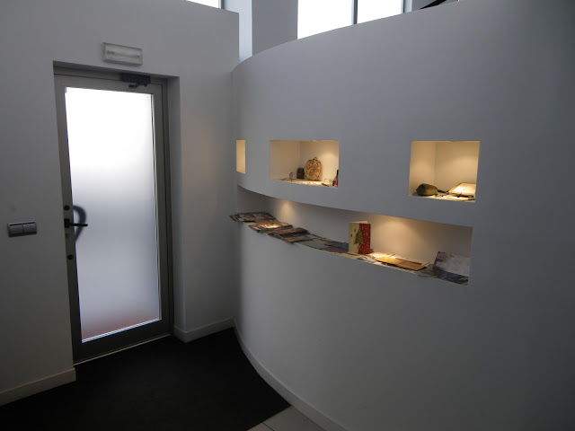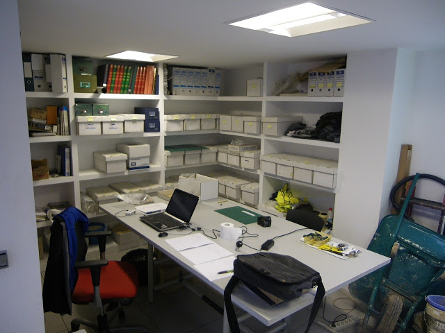 zona de almacén con vitrinas de obra, gran mesa central, servidor.