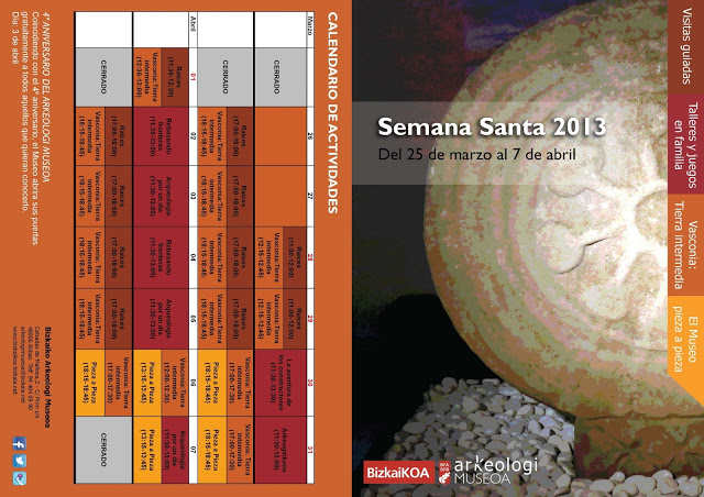 Desde el Arkeologi Museoa de Bilbao nos llega su programa de actividades para la Semana Santa. Si vas a estar en Bilbao y no conoces el Museo es una gran oportunidad, y si ya has estado, las actividades siempre se renuevan, por lo que vas a ver cosas distintas y relacionadas con la Arqueología.